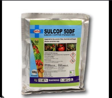 SULCOP® 50DF is a broad spectrum, inorganic green copper fungicide. It is a contact, preventive fungicide for the control of a wide range of diseases such as late blight of potatoes, tomatoes and other vegetables, leaf spot diseases, Downey mildews, cankers, scab and asparagus rust etc. it is a multi- fungicide that prevents germination of fungal spores killing them. it disperses readily in water and spread evenly on the leaf surface.CROPS & APPLICATION RATES: Vegetables, e.g. French beans : Rust, Anthracnose, Bacterial blight Brassica : Downey mildew, Black rot, White rust